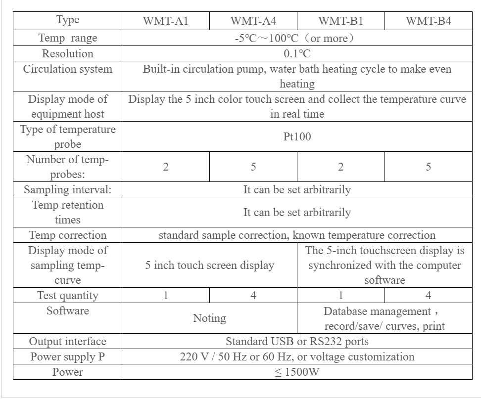 6. Two or five Pt100 temperature probes are configured, one of which is built in to control the water bath temperature and the other one to test the sample temperature, greatly reducing the temperature test error.